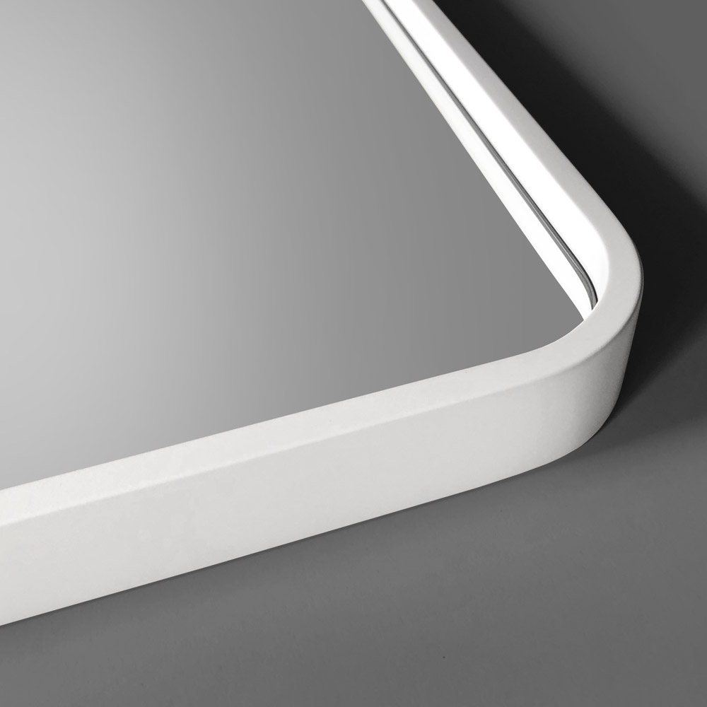 Piękne lustro w cienkiej białej ramie z zaokrąglonymi rogami podświetlane od tyłu. Uniwersalny model, który wpasuje się zarówno we wnętrze urządzone w stylu skandynawskim, jak i modern czy eklektycznym. Zaokrąglone rogi lustra świetnie pasują do zaoblonych kranów czy armatury w łazience, a zawieszone w przedpokoju, przełamią linie proste i przydają wnętrzu delikatności. Promień zaokrąglenia 5 cm.