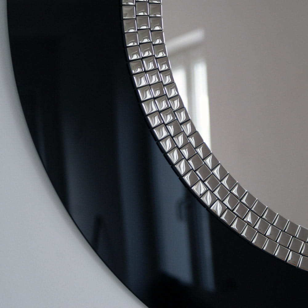 Eleganckie okrągłe i dekoracyjne lustro w czarnej ramie zdobionej srebrną mozaiką. Ponadczasowy wzór nawiązujący do stylu Art Deco. Idealne do dekoracji salonu, jadalni czy sypialni. Nadaje się również do łazienki.