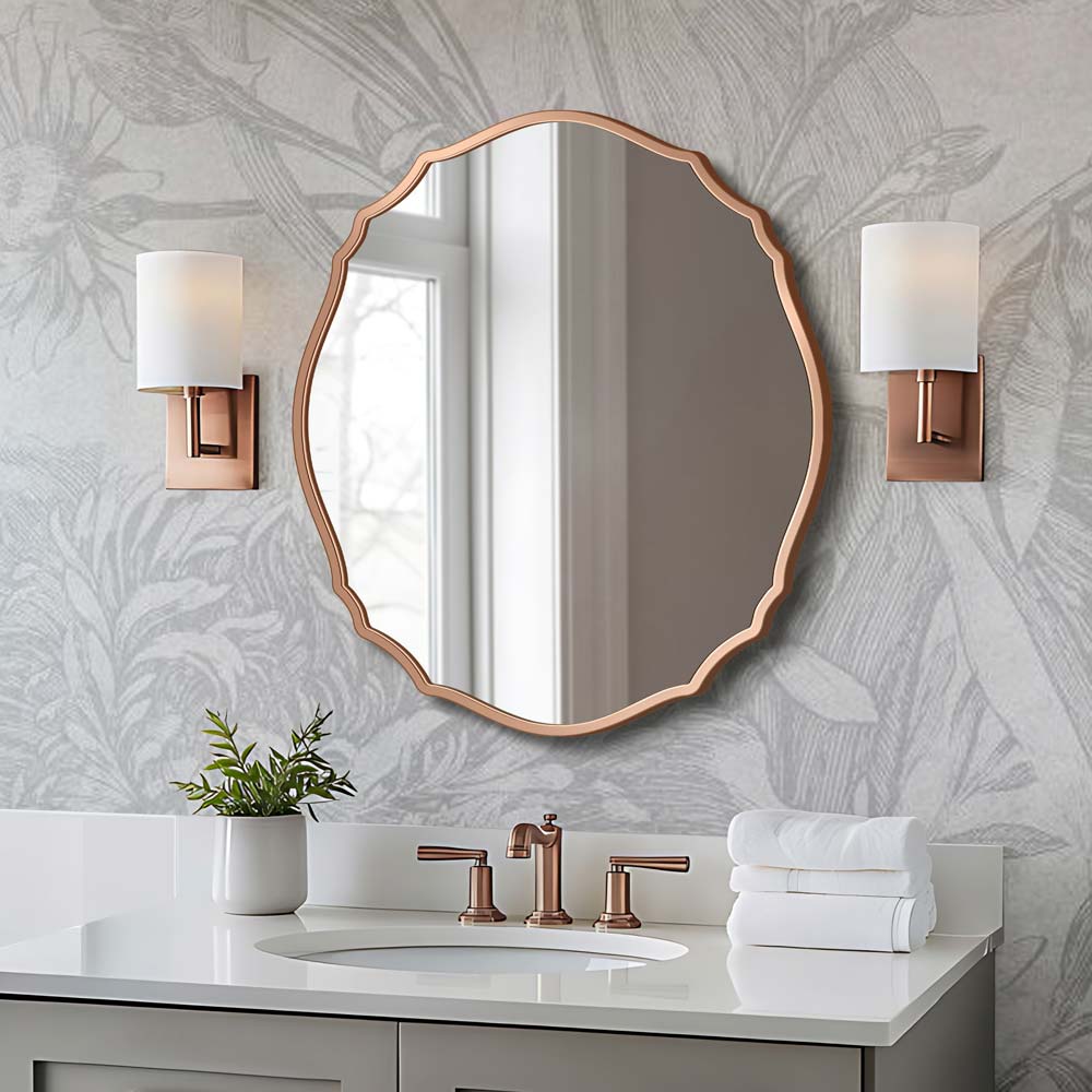 Zjawiskowe lustro do łazienki retro Grand Vila w metalicznej miedzianej ramie to połączenie neowiktoriańskiego szyku z sielskim spokojem. Jest to wymarzony dodatek dla osób ceniących przestrzenie z duszą, w których króluje przytulna elegancja. Zamiast klasycznych, surowych linii, intrygująca, pofalowana forma. Dzięki takiemu zabiegowi tafla zyskuje retro oprawę i staje się prawdziwą, wnętrzarską biżuterią.