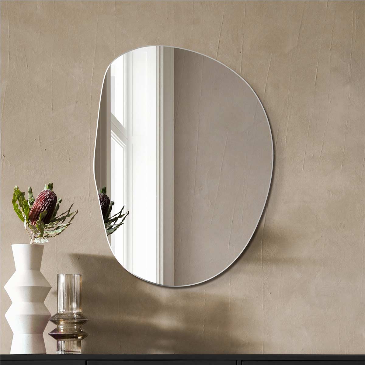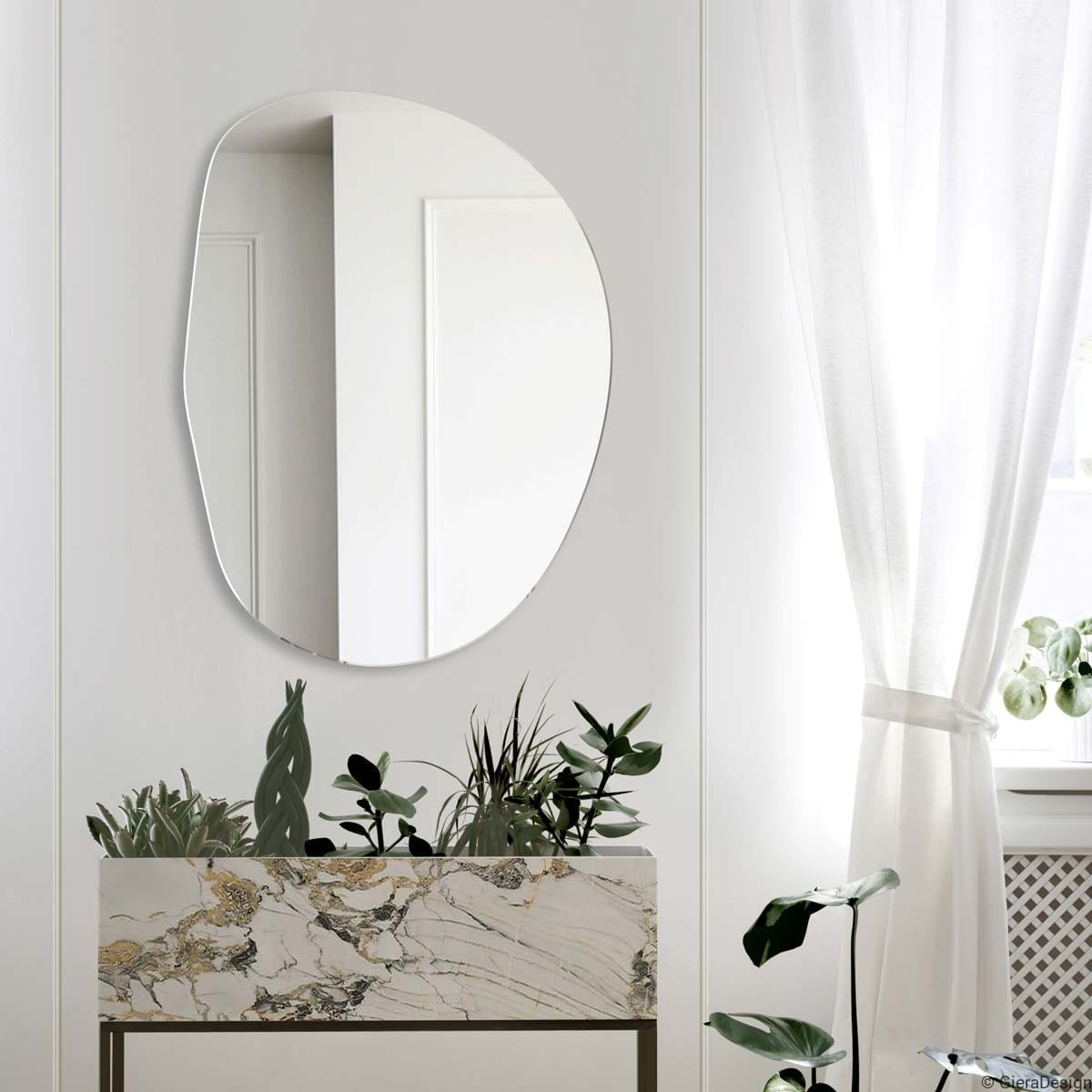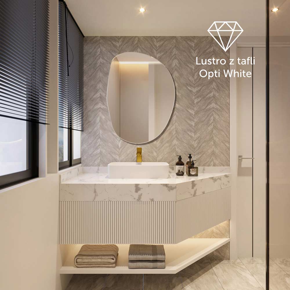 Wykonane z najwyższej jakości tafli Opti White, oferuje krystalicznie czyste odbicie, bez zielonkawego zafarbu typowego dla standardowych luster. Krawędzie są starannie szlifowane i polerowane, co podkreśla rzeźbiarski charakter bryły i sprawia, że lustro dobrze wygląda z każdej perspektywy. Plama no.2 sprawdzi się w łazience nad toaletką, w sypialni lub jako dekoracyjny akcent nad komodą – wszędzie tam, gdzie chcesz przełamać geometrię wnętrza jednym mocnym, ale eleganckim gestem.