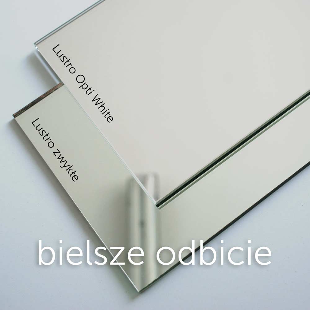 - To niezwykle czyste super białe lustra o znacznie wyższej przejrzystości szkła od zwykłych. Mają obniżoną zawartość żelaza, co pozwoliło w znacznym stopniu wyeliminować typowe dla szkła zielonkawe zabarwienie. Lustra Opti White nie zawierają ołowiu i są prawie bezbarwne – mają czystsze odbicie i zdecydowanie jaśniejszą krawędź.